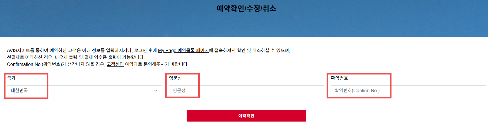 1. 예약확인/취소(www.avisrentacar.kr/reservation/view-modify-cancel)를 통해 예약 건을 조회하세요.